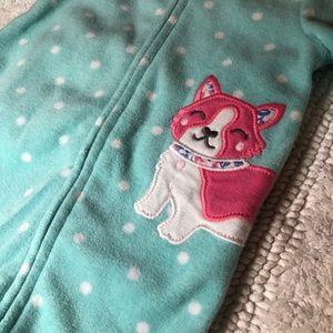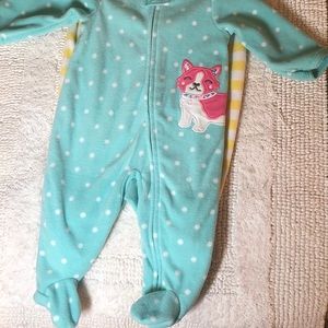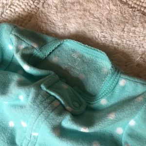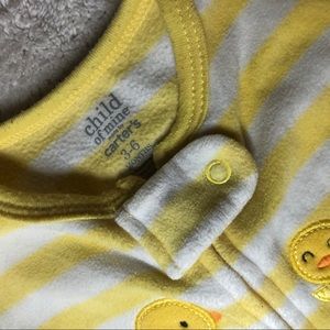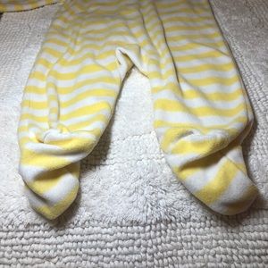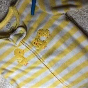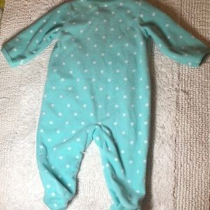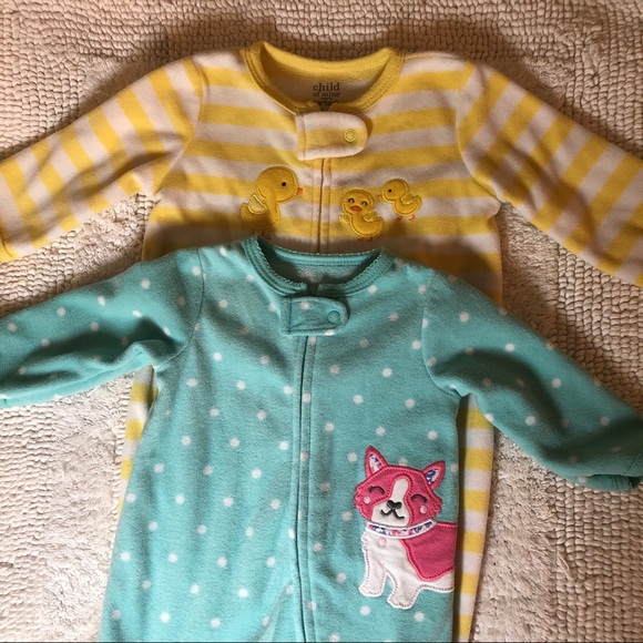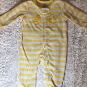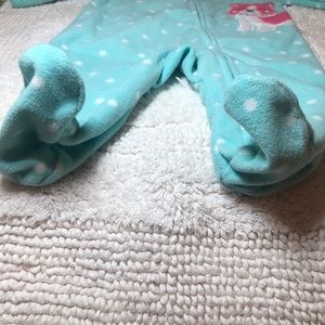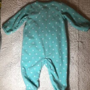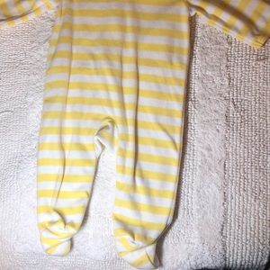Bundle of 2 Carter’s fleece zip onesies/bodysuits/pajamas with the feet with the rubber grips. The blue is size 3M and the yellow is size 3-6M. There is a very very faint stain on the yellow that I tried pointing out in pic #4. Otherwise these are excellent condition.
