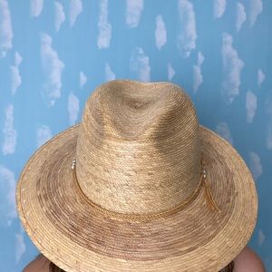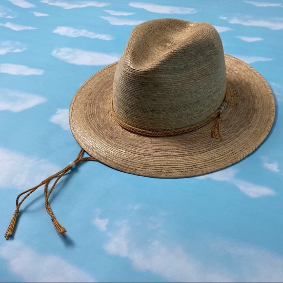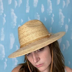 This is a beautiful vintage straw cowboy hat. It is a woven straw bolero style hat with a 3” brim. It has a woven neckpiece with a plastic bead fastener. The base It is soft, not the hard straw you would think of. Around the base also has decorative woven string. It is a size 57, which is approximately 24.5” around