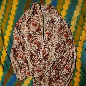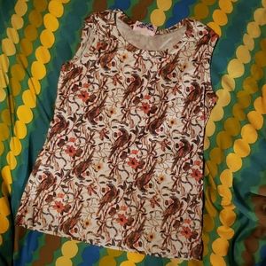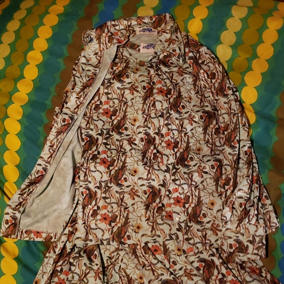 INSANE 3 pc suit from the 1970s or 60s! Stretchy teal polyester tank top, A-line cut midi skirt, and button-down long sleeve covered all over in plants and birds! By Lucky Tops USA.