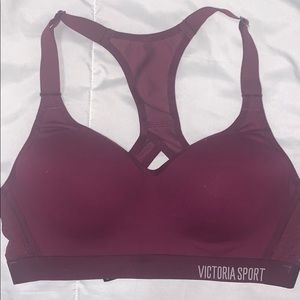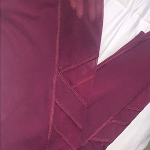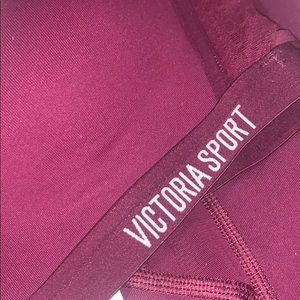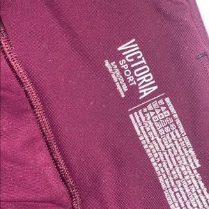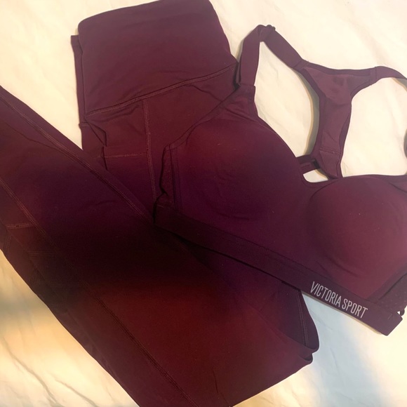 Beautiful burgundy VS workout set. Sports bra is a 32 B padded with mesh detailing & a keyhole ring back. Sports bra does have a bit of fraying (shown in photo). Leggings are a SZ small with mesh detailing & pockets on both sides!