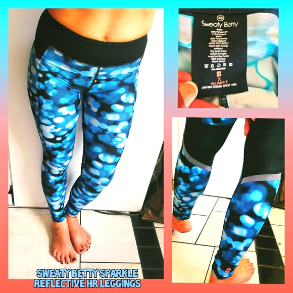 Great condition. Sweaty Beatty sheer detail on back with reflective sparkle outline. Blue lights HI Rise with zipper in the back of the waist band. Modelfit with coral logo on the ankle. Size XS similar to Luxtreme Lululemon material. Squat proof. Check my closet for lululemon, Nike, Reebok, gym shark alo vs pink and more.