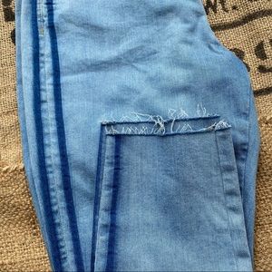 - light wash denim with dark blue stripes on the side and raw hem