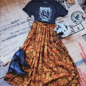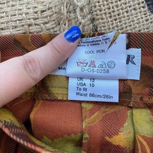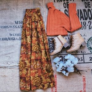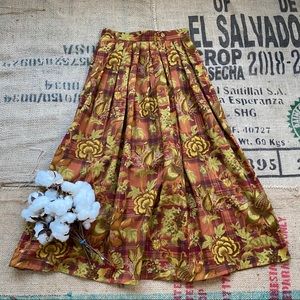 - autumn toned plaid and floral patterned midi skirt