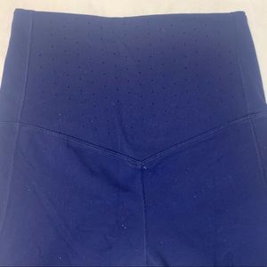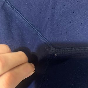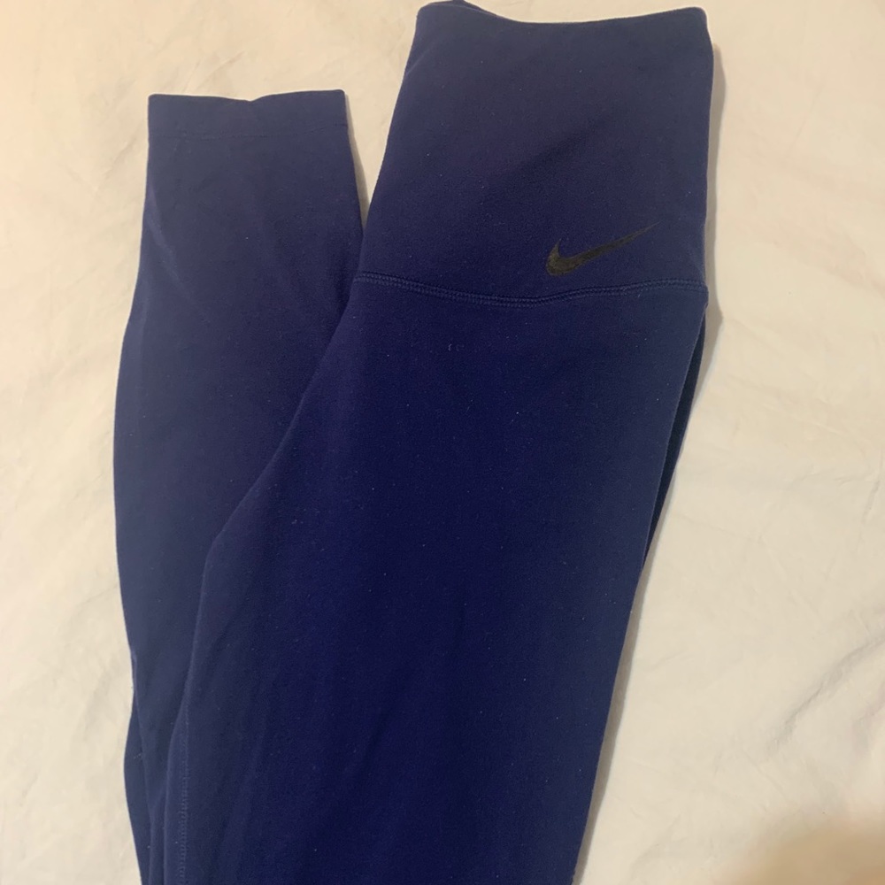 NIKE DRI-FIT navy blue leggings sz small. One of my favorite leggings due to these being squat proof & the detailing of the back giving you a nicer looking ๐! These leggings do have a small hole in the back which can be sewn easily.