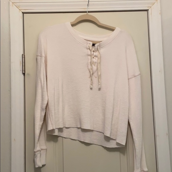 Women’s size XS. Waffle tee with cute criss cross at front. White/cream color. Super cute and worn once! It’ll look cuter on someone else lol🤣