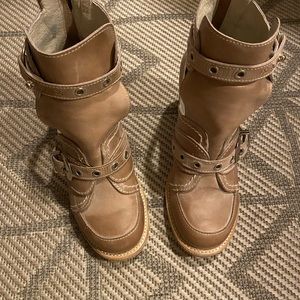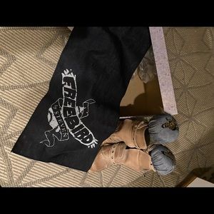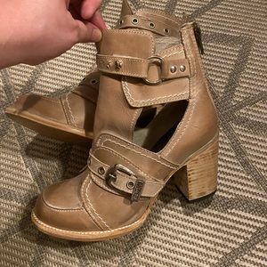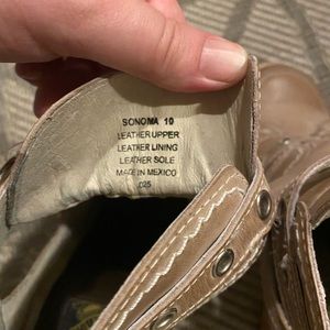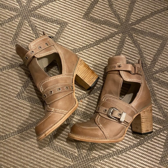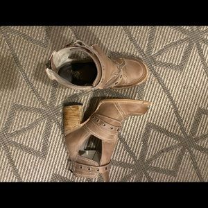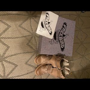 These were only worn once. I love them so much but they’re just too tight. There’s one thread that is coming undone but there’s a buckle that holds the piece in place.