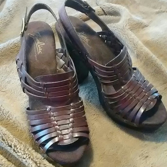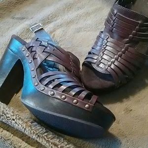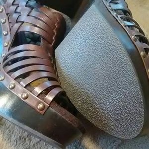 Chocolate brown strappy sandals in beautiful unworn condition.Gold studs and buckle strap.Heel is 4and 1/2" ...with front platform of 1and 1/2" at its highest point.Great sandal if you need the extra height.All man made materials, but looks like real leather.