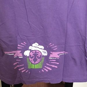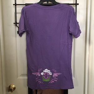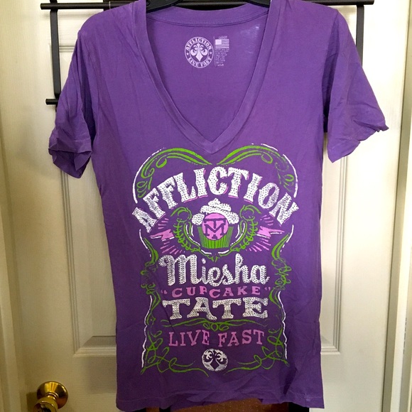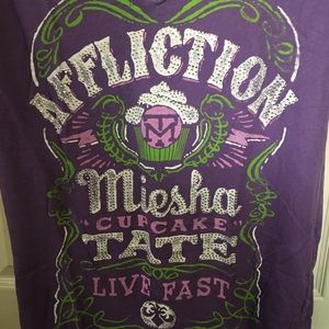 Awesome Miesha Tate cupcake tee. Meant to be distressed in true Affliction style. Rhinestone detail on lettering on front with Miesha’s cupcake on the back bottom. Really cute piece!