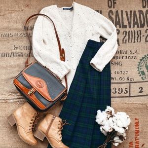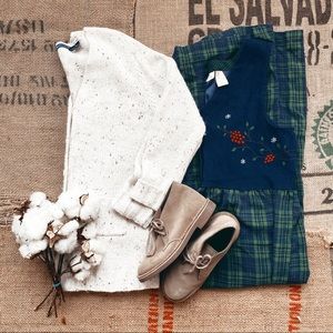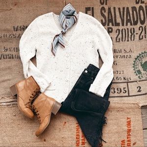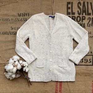 - Speckled cream/oatmeal colored cardigan with buttons up the front and cute little pockets