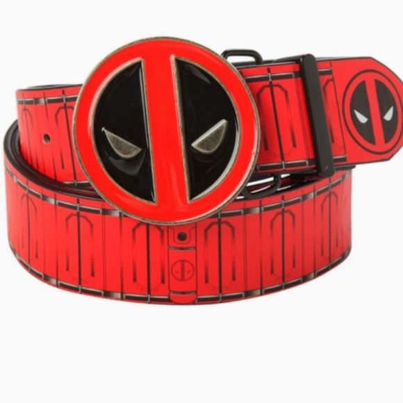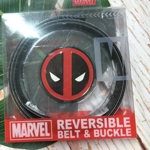 Marvel Deadpool Reversible Belt & Buckle Set Condition: New Product Details: Keep your pants on with this Deadpool reversible belt and buckle set from Marvel. Black faux leather with debossed "Merc with a Mouth” Faux leather Continuous Comic Style images Black & Red tone Circle shaped buckle with Deadpool face die cut design Polyurethane metal 48" long / cut to fit