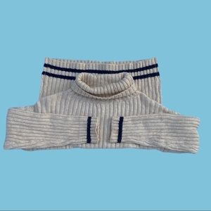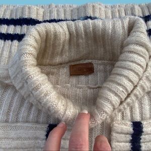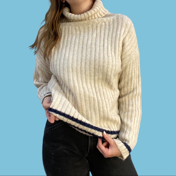 Helllaaa soft super high turtleneck in light brown with navy stripes on sleeves and across bottom.