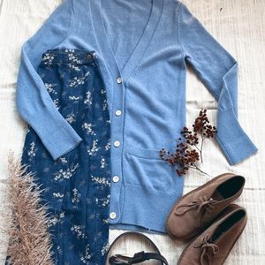 - Dark periwinkle colored long cardigan with white buttons and pockets!
