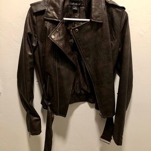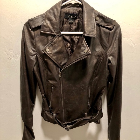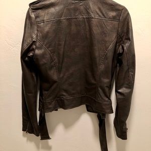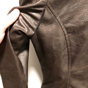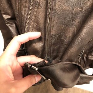 Brown leather jacket. Size Small. It’s a little worn down. Has a rip near the back left armpit and a small rip on the belt.