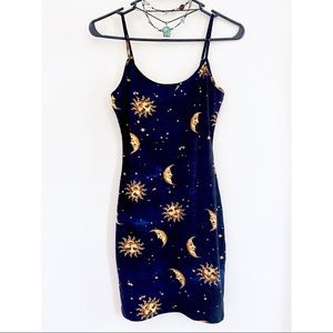 Soft and comfy bodycon mini dress with night sky/sun moon and stars pattern ๐ Adjustable straps. Fits true to size. Brand new condition, only worn once!