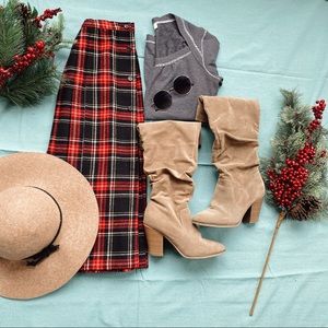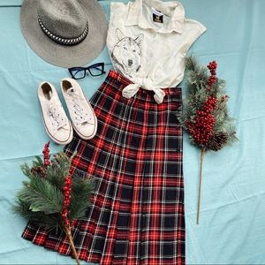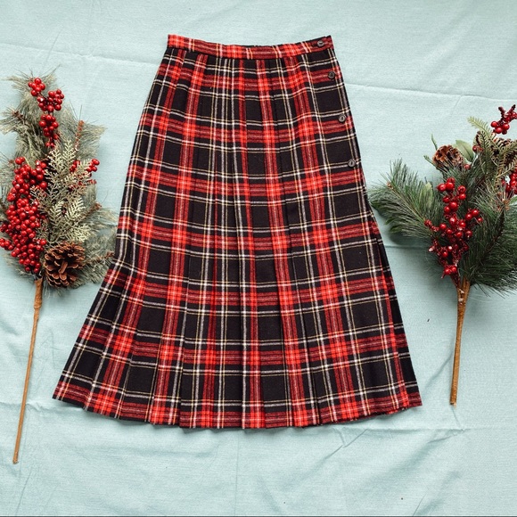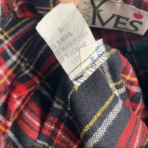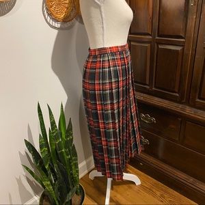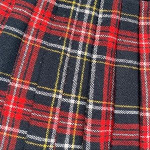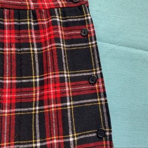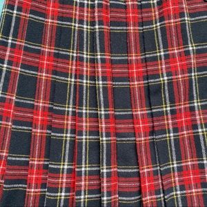 Plaid wrap skirts are my favorite and this one is perfect. I love the pleating and the color combo. Fastens by buttons at the waist and hip. Great condition minus some pilling. Wool, polyester and acrylic blend but doesn’t seem to feel itchy. Best fit for an XS/S (see measurements). No stretch to the fabric.
