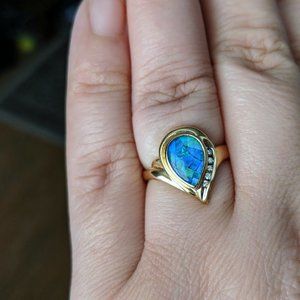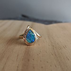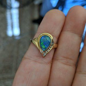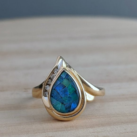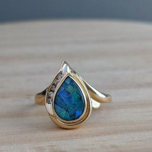 Beautiful pre-owned solid 14k yellow gold mosaic opal and natural diamond ring with flashes of blue and green. The pieces of opal have been arranged in a pear shape and are protected under glass or clear quartz.