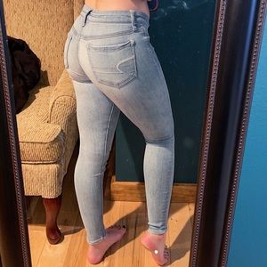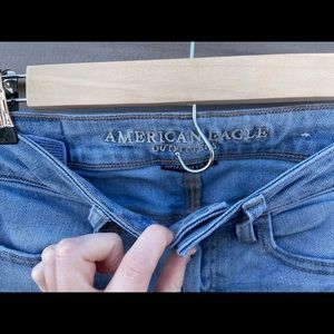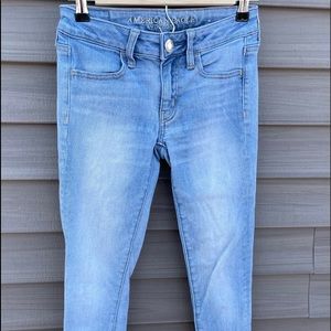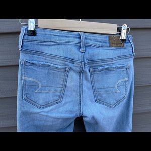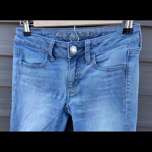 Very cute, light wash, American Eagle skinny jeans. Have been worn a few times with very little wear and tear. I am