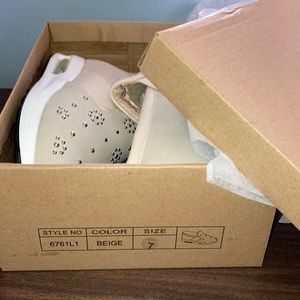 New In Box Beige slip on shoes. Very pretty embellished bling. Comfortable. True to size.