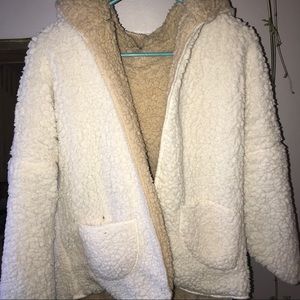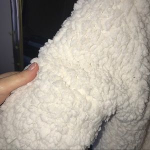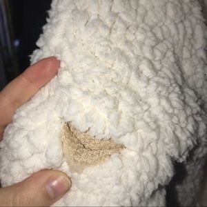 This Sherpa is super soft and cozy! It is reversible! There is a hole that is on the seam of one of the arms (pictured). But it is not noticeable unless it’s being pulled apart (pictured). When not being pulled you can not see it (pictured). There is no take but it fits like an XS/S