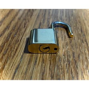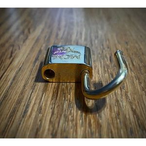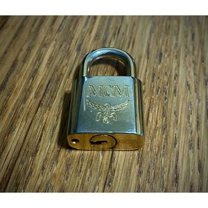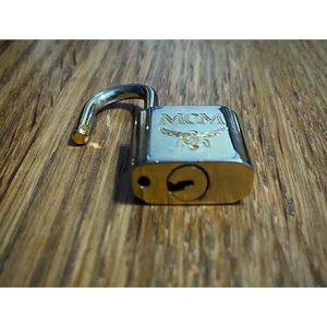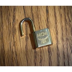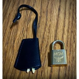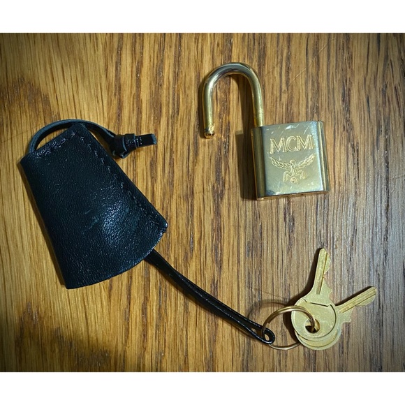 UNISEX - 100% authentic MCM gold color padlock and 2 keys with clotchette bell for storage. Clotchette bell material black leather. Use to attach padlock and keys or as an embellishment to any purse, duffel bag, travel bag, briefcase, etc. Keys can stay on and doesn’t have to be removed from clotchette bell to be used on lock. NO TRADES