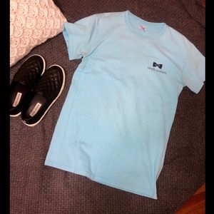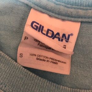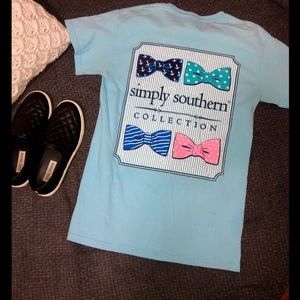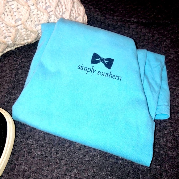 Simply Southern Gildan T-Shirt. Size: Small. Baby Blue in color. Good condition, worn a few times. Only issue is 2 small stains on the back of the shirt towards the bottom and I feel like I see a faint make-up line around the neck of the shirt on the front side but still very faint, price does reflect issues!