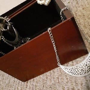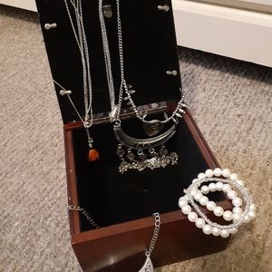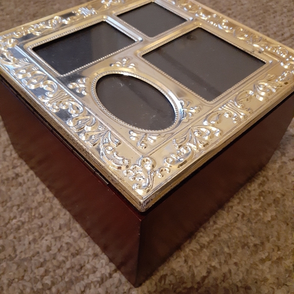 Cherry wood and pewter photo or jewelry box. Jewelry included. Pre-owned.