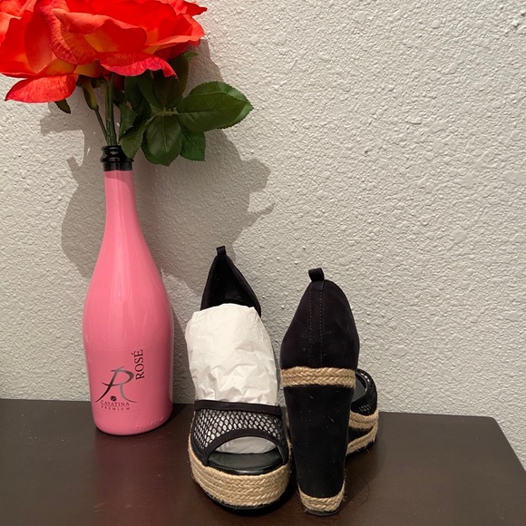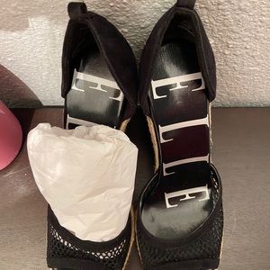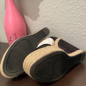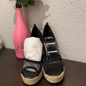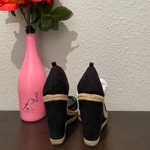 ELLE - Black & wicker braid wedge sandals; Size 6.5