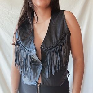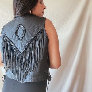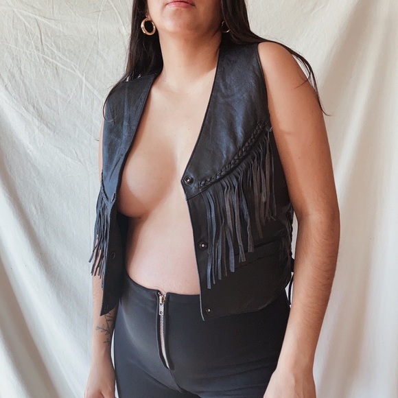 Vintage fringe leather vest. Amazing confirm. Features crisscross sides. Side mini pockets. Seen on a small model.
