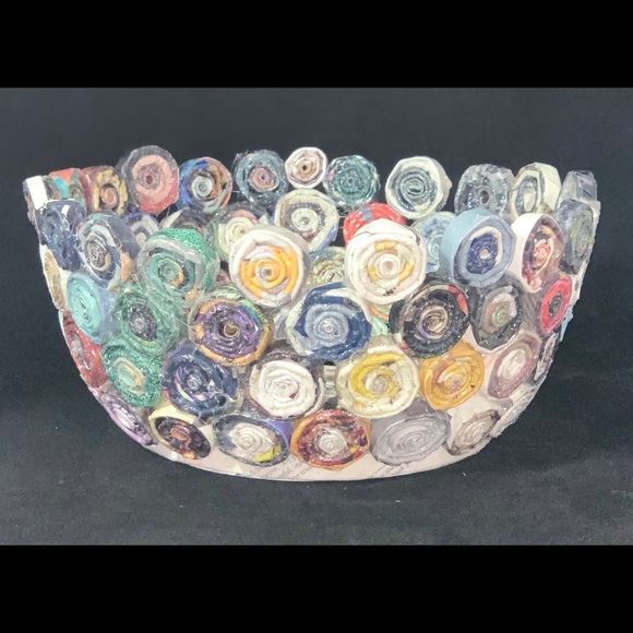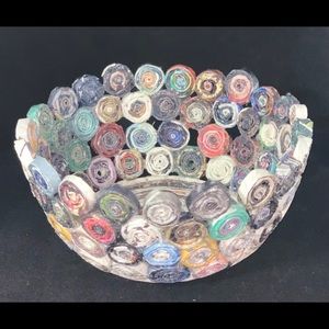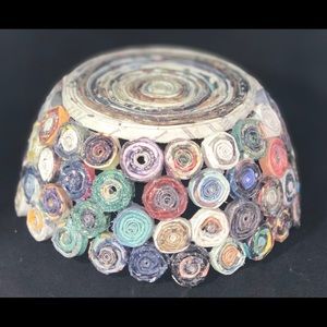 Handmade out of recycled magazines. Each bowl varies in color. Trying to clean up the world by recycling what I can and support my family during this pandemic while I can not find work.