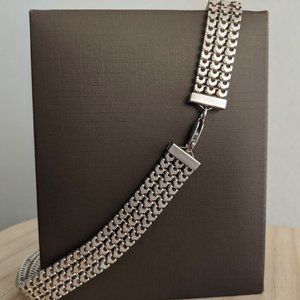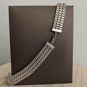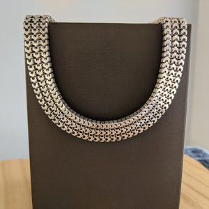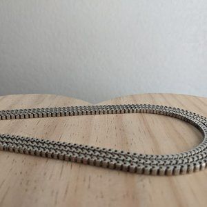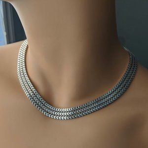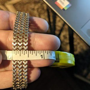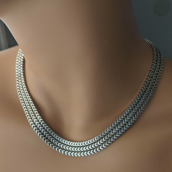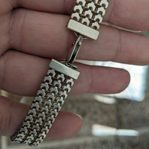 Solid .925 sterling silver vintage mid century necklace. The necklace measure 18 1/4 inches with the clasp. Solid .925 sterling silver stamped and acid tested as shown in photos. Weighs 36.70 grams on my scale your may differ slightly. links measure just shy of a 1/2 inch wide. The necklace is very comfortable on. This is a pre-owned necklace in excellent condition with no visible damage. Price is firm on this necklace.