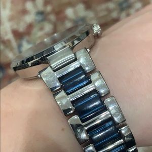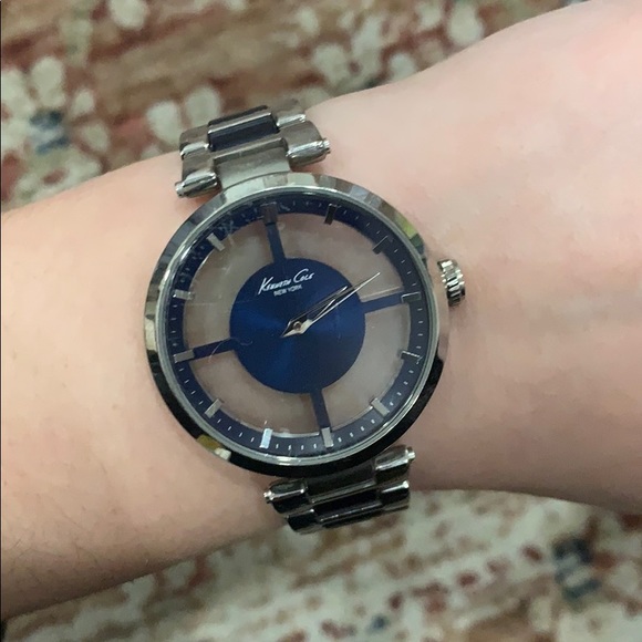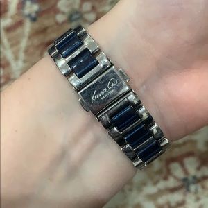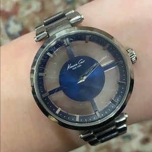 Silver and navy Kenneth Cole watch — unique face! Navy and silver links with a see-through face and navy accents. Lightweight. Fits small wrist. Minor wear throughout but still plenty of life to live!