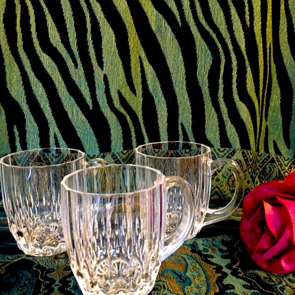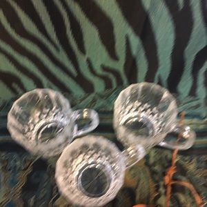 Three vibrant lead crystal mugs without label. 4” tall 3 1/4” across top. Like new.