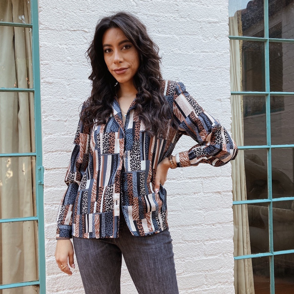 Vintage multi animal print blouse. Amazing condition. Shoulder pads. Seen on a small model.