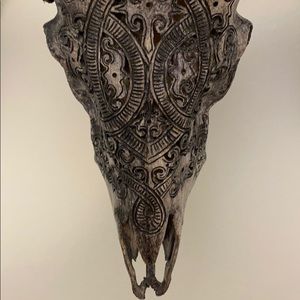 This authentic Iranian ram skull is one of a kind, and a great conversational piece, especially in a BOHO styled home. This antique piece was chiseled by a tribal member who imprinted this piece with tribe specific markings. You won’t find another like it.