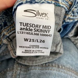 Silver Jeans- Tuesday mid ankle skinny style. Super stretch W25 L26