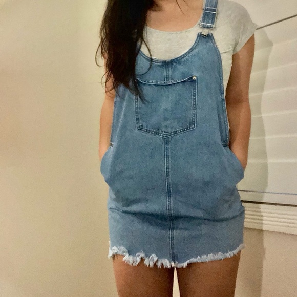 cute vintage mini skirt overalls blue denim overalls with fringe bottom that has 5 working pockets adjustable straps, can fit any size (S-L) depending on desired fit!