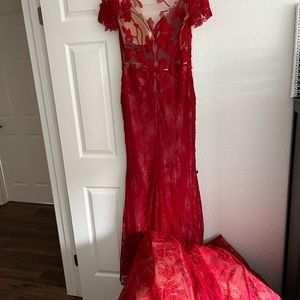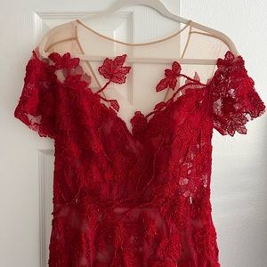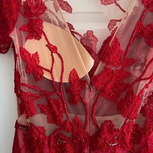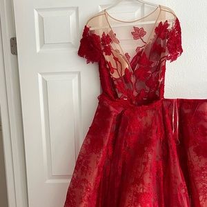 Tarik Ediz, floral embroidered, short sleeve, illusion neckline, layered long evening dress.