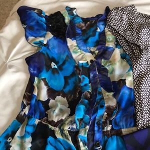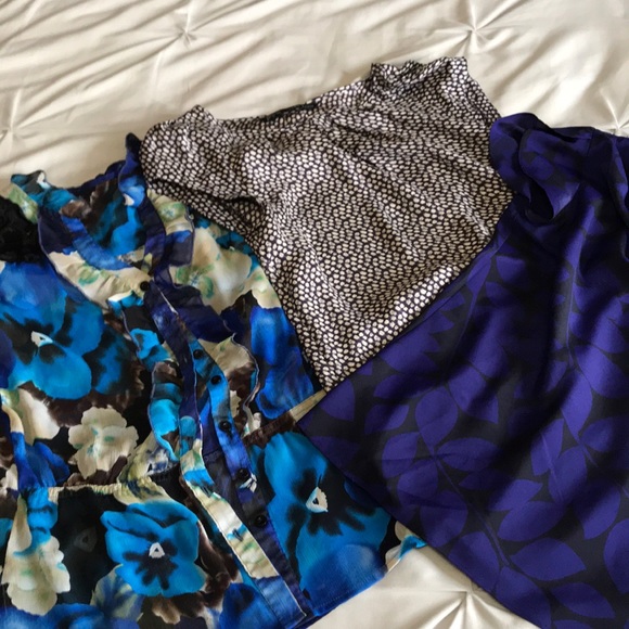 Dark blue and black Banana Republic with split cap sleeve size s, blue and tan Zara Basic size EU s and the last one with teals and blues blacks, brown and tans(cut tag off so don’t know the brand. Would say size s)