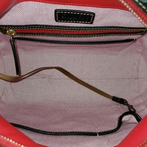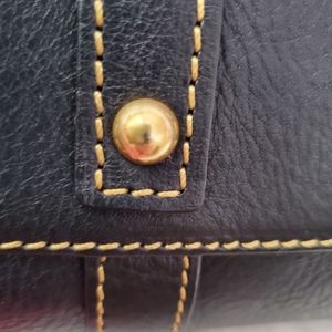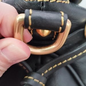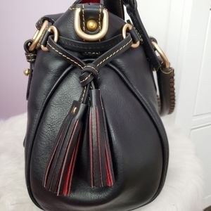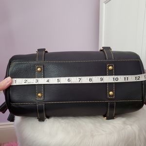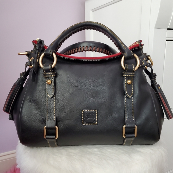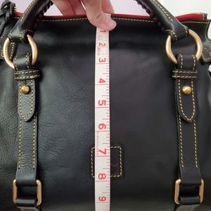 Made in America Florentine Small Satchel in the color black. What makes the made in America bags different are the lining of the bags. The tassels and inside are lined with a red smooth leather as opposed to the green suede and the interior fabric is a thick gingham lining. Bag is in excellent used condition with only slight rubbing to the side D rings where the shoulder strap attaches to and some slight scuff marks on the bottom feet. Comes from a smoke free/pet friendly home