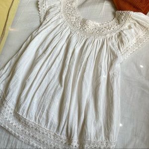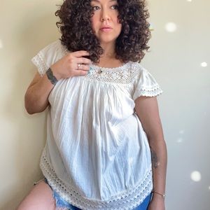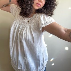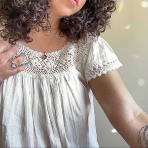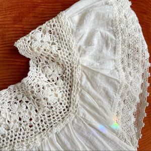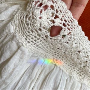 No size tag but can fit up to a Large with crochet collar and sleeves *small undoing of crochet on back (pictured)*