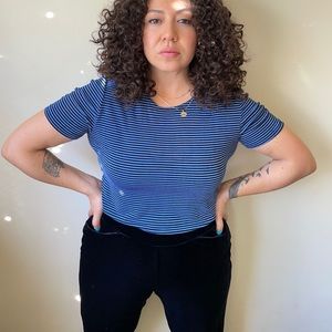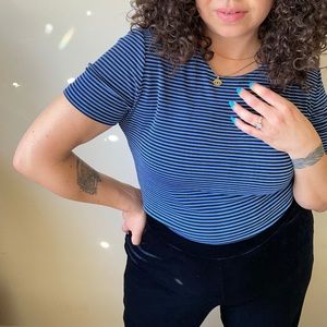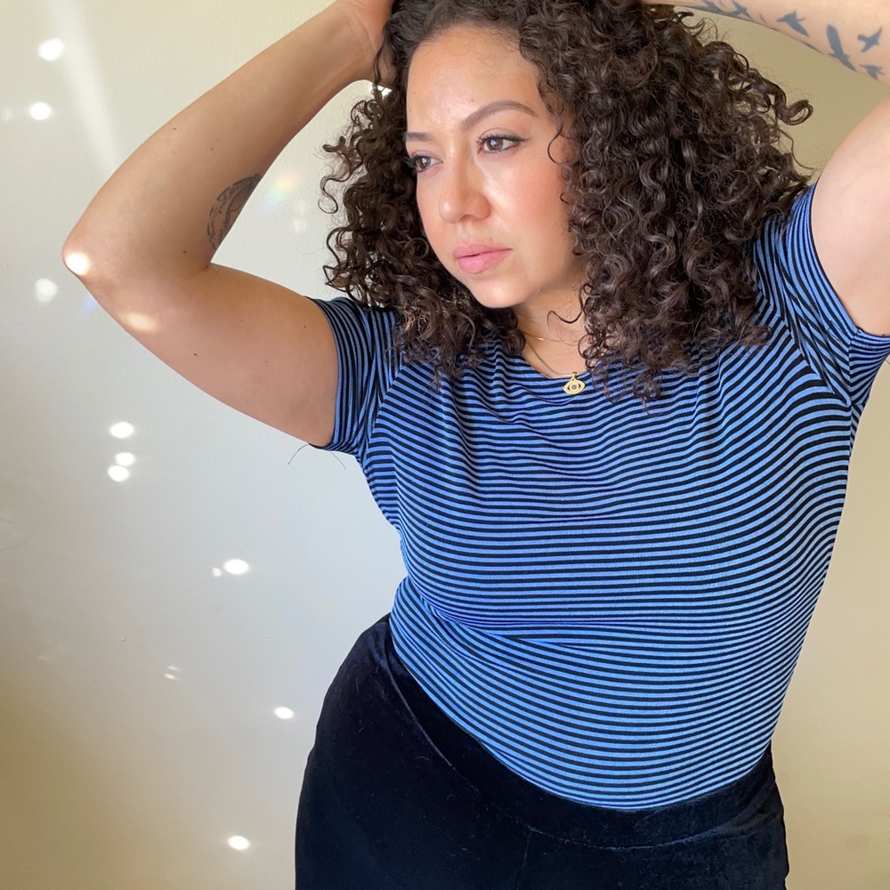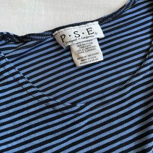 Vintage Blouse from P.S.E Size Medium Vintage Black/Blue Striped Blouse made of 90% Nylon and 10% Spandex Pit to pit: 17in Overall length: 23in