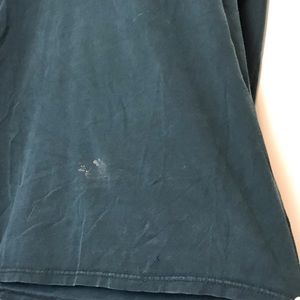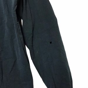 Preowned, not quite thrashed, more like perfectly distressed.The black has a nice fade overall, there are some spots of discoloration, small hole(s) near the bottom front, and a hole underneath the left arm. Pictures provided.