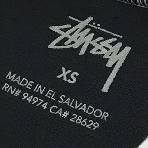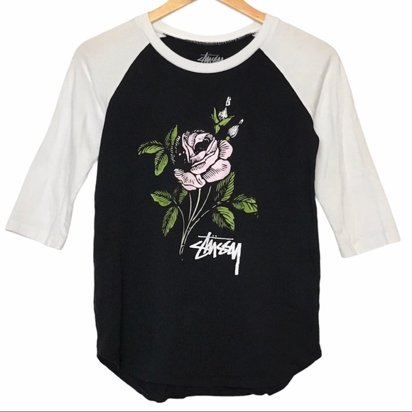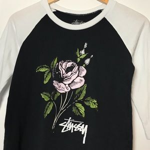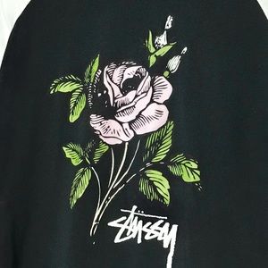 Black with white sleeves and rose graphic with Stussy spellout on the front