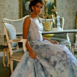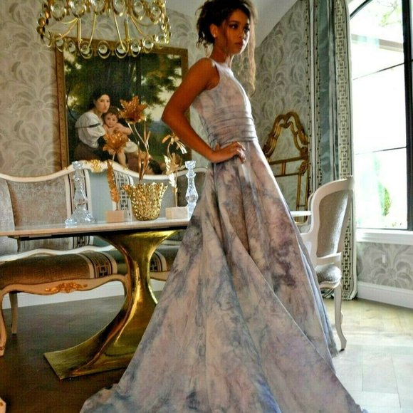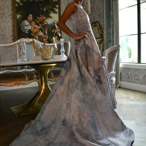 Designer Paloma Blanca Collection wedding dress that has been Hand painted. Painted In Blue, purple, and Pink Tones.