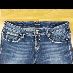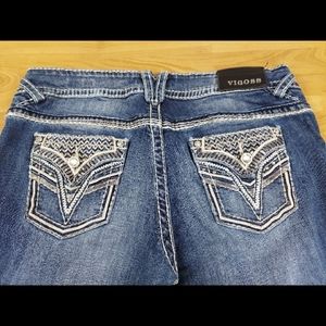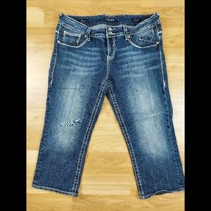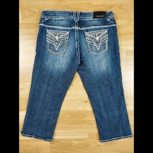 Style: Embroidered Embellished Faux Back Flap Pocket Western Capri Denim Jeans