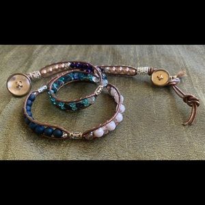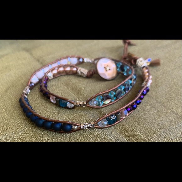 Handmade on bronze metallic cord wraps around wrist 3x and is made with assorted crystal beads . Has a button closure.
