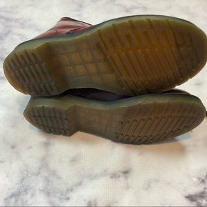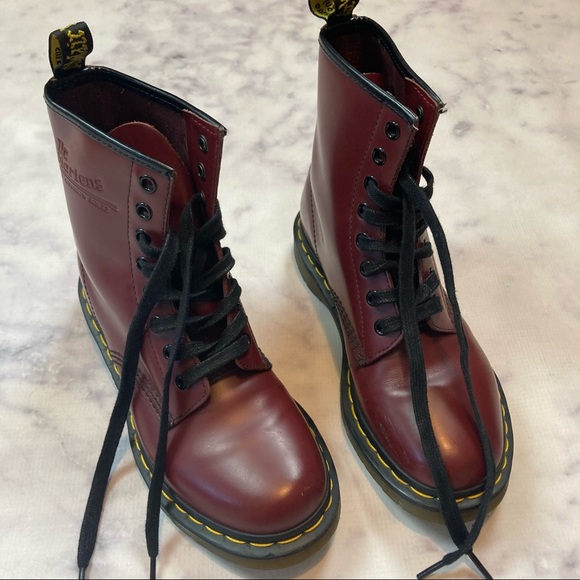 dr. martens 1460 red cherry lace up boots. these boots were only worn a few times and are in great condition. all signs of wear are pictured and the boots feature the dr. martens stamp on the side of each boot as well as the iconic yellow lace and air wair pull tabs. women’s size 7. feel free to ask if you have any questions!