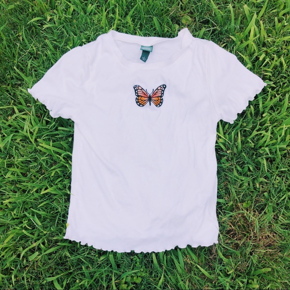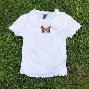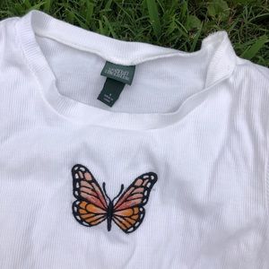 Cute white top with an orange and black butterfly on it. Has a ruffle hem. Slightly cropped. Super soft and stretchy. By the Wild Fable line at Target. Perfect with ripped black jeans!