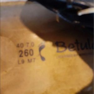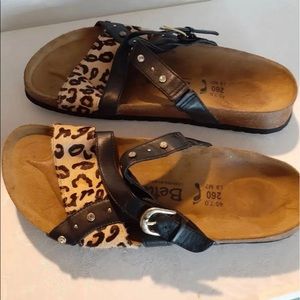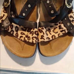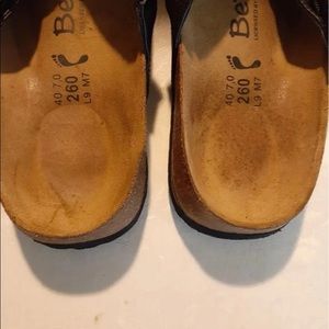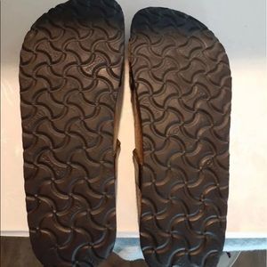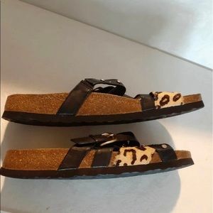 Tan cork footbed and a black cushioned bottoms- Slip on design