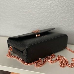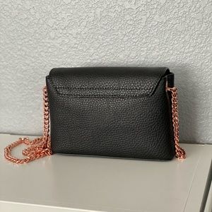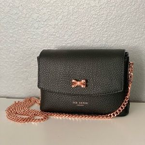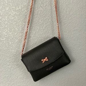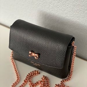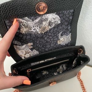 Beautiful Ted Baker crossbody! Rose gold chain, black pebble leather exterior, and cute animal print inside